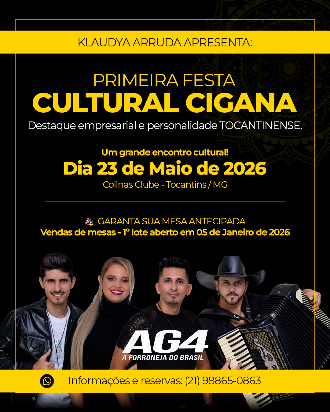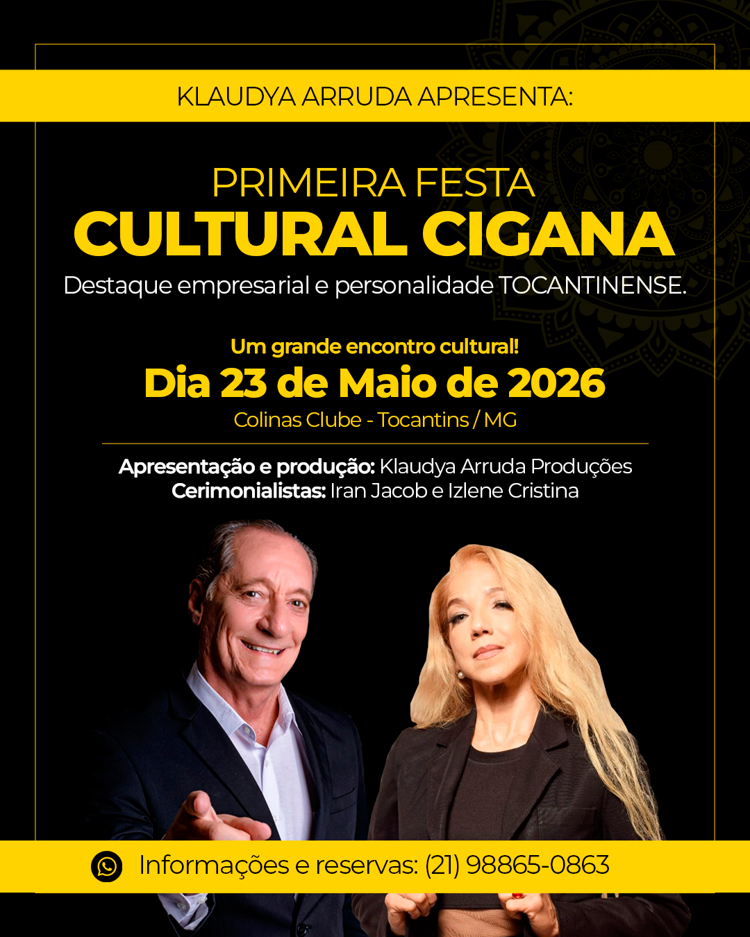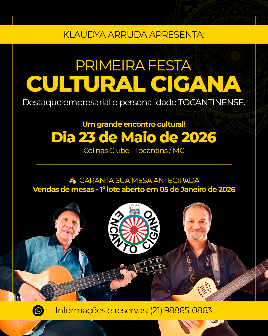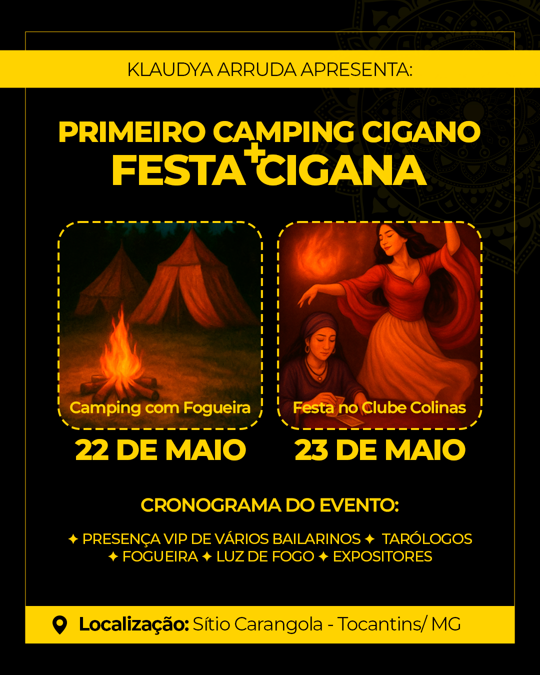 Banner de divulgação da Primeira Festa Cultural Cigana, destacando o local Colinas Clube em Tocantins/MG e a data 23 de maio de 2026. O visual traz elementos dourados sobre fundo preto e o texto “Klaudya Arruda Apresenta: Um grande encontro cultural”.